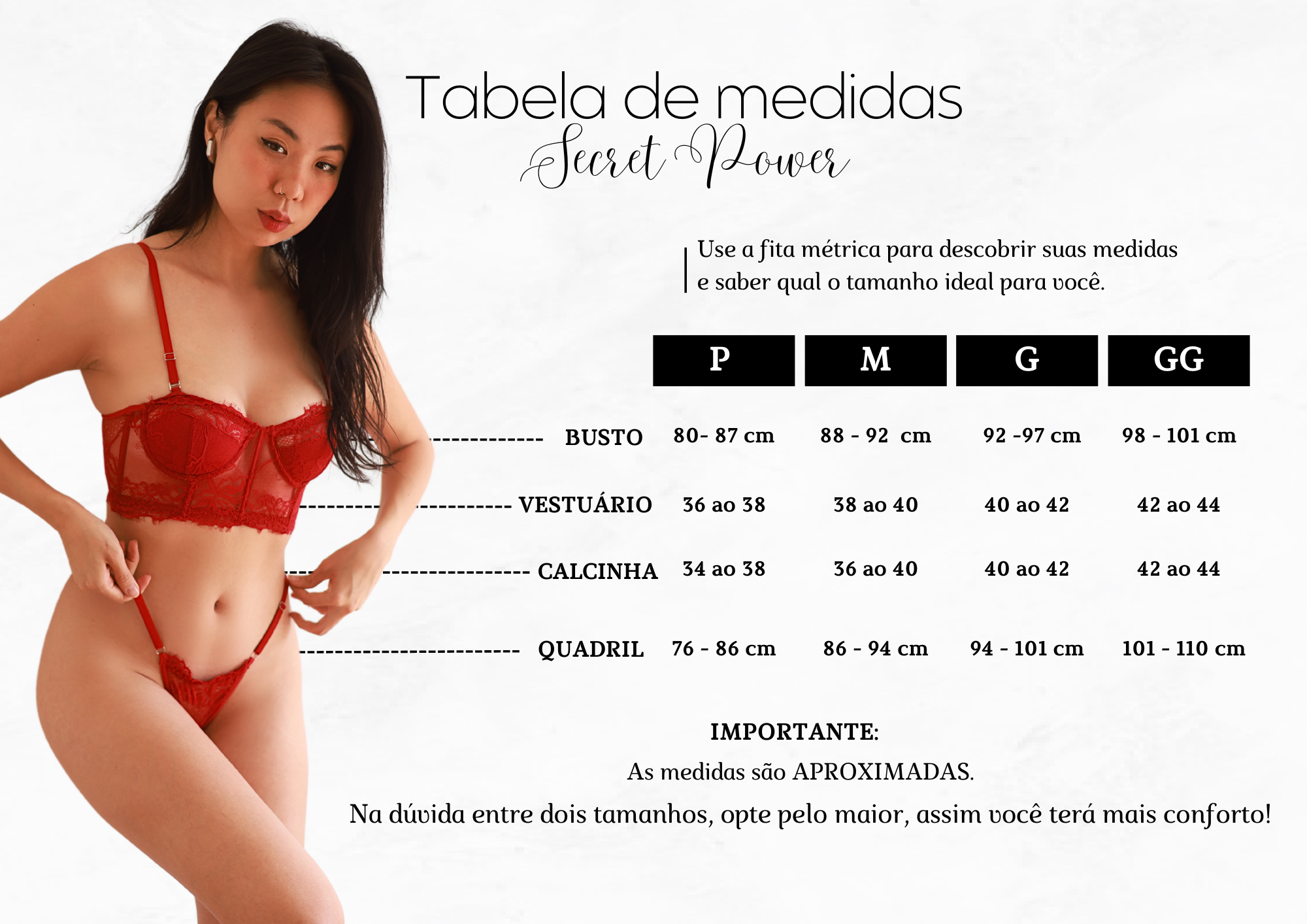 Devido a elasticidade dos tecidos as medidas acima são aproximadas, não exatas. Na dúvida entre 2 tamanhos, opte pelo maior assim você terá mais conforto, a Renda e Microfibra possuem bastante elasticidade.